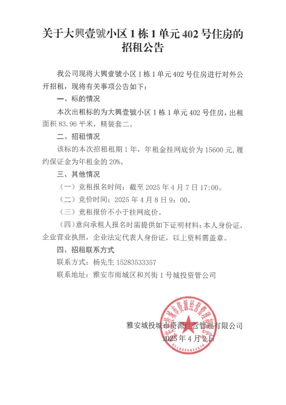 關(guān)于大興壹號小區(qū)1棟1單元402號住房的招租公告