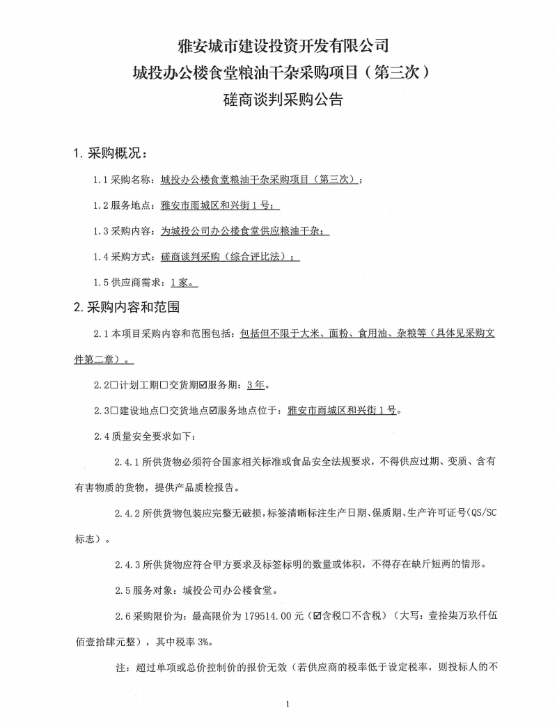 雅安城市建設(shè)投資開發(fā)有限公司城投辦公樓食堂糧油干雜采購項(xiàng)目(第三次)磋商談判采購公告