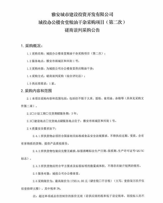 雅安城市建設(shè)投資開發(fā)有限公司辦公樓食堂干雜采購項(xiàng)目(第二次)磋商談判采購公告