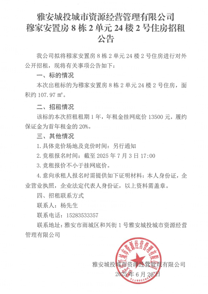雅安城投城市資源經(jīng)營管理有限公司穆家安置房8棟2單元24樓2號住房招租公告