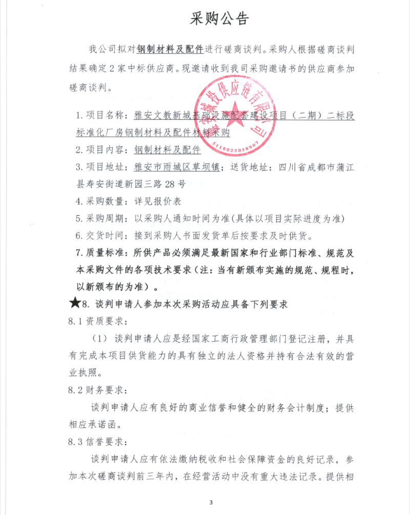 雅安文教新城基礎(chǔ)設(shè)施配套建設(shè)項目(二期)二標段標準化廠房鋼制材料及配件材料采購公告
