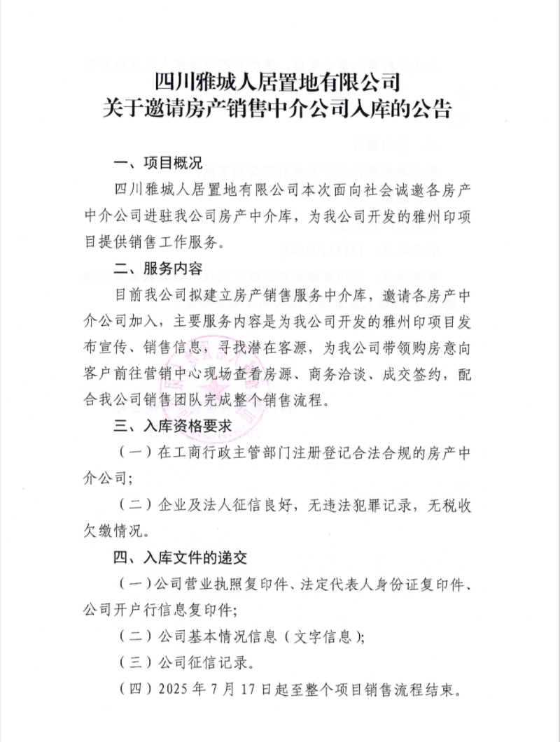 四川雅城人居置地有限公司關(guān)于邀請房產(chǎn)銷售中介公司入庫的公告