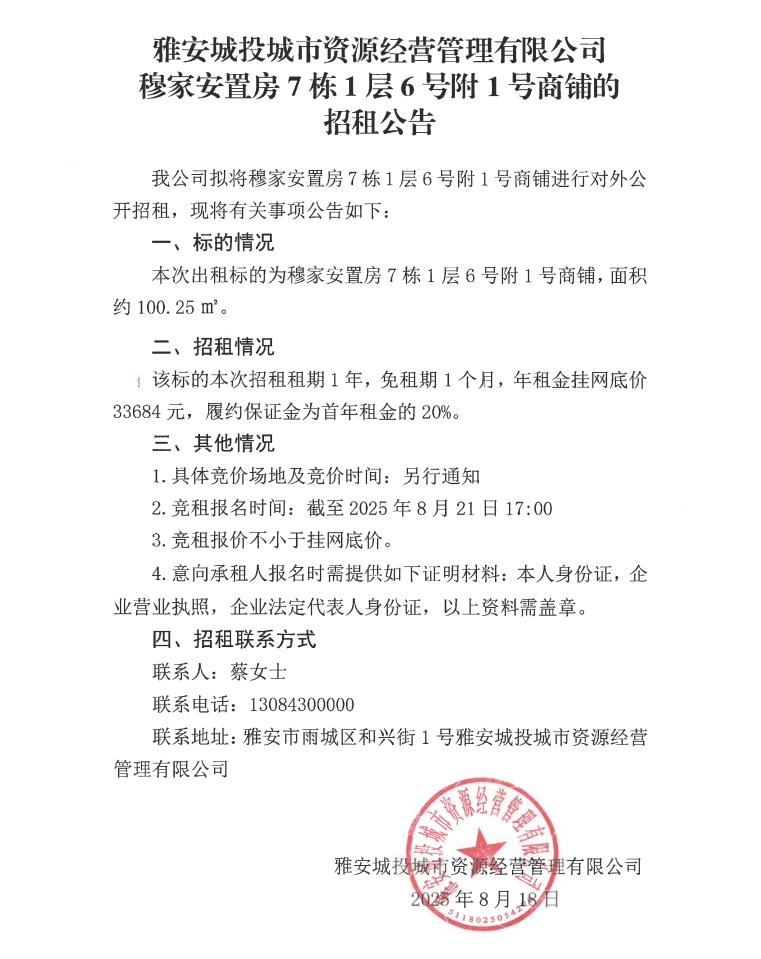 雅安城投城市資源經(jīng)營管理有限公司穆家安置房7棟1層6號(hào)附1號(hào)商鋪的招租公告