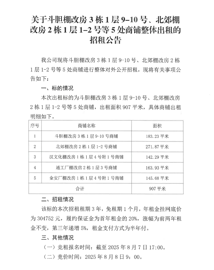 關(guān)于斗膽棚改房3棟1層9-10號(hào)、北郊棚改房2棟1層1-2號(hào)等5處商鋪整體出租的招租公告