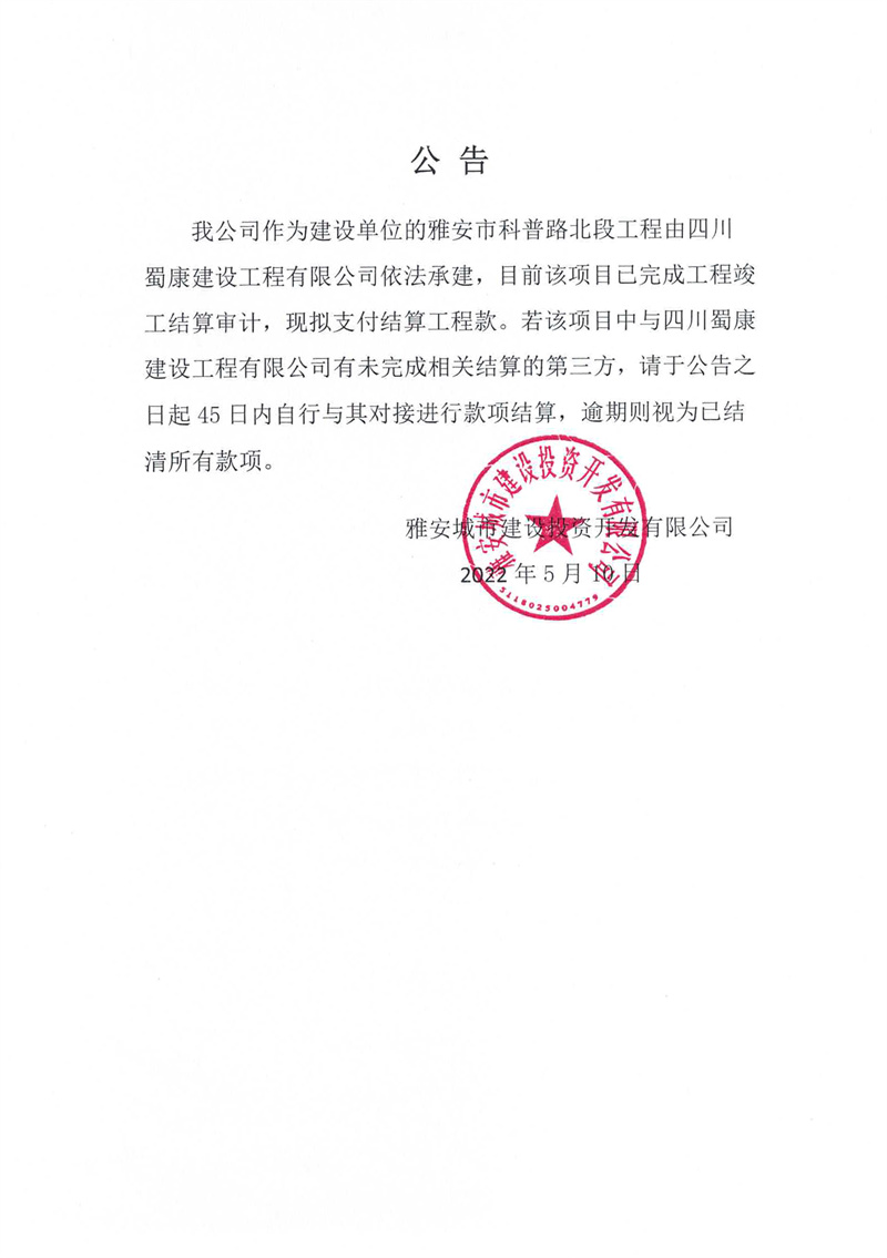 關于雅安市科普路北段工程的公告